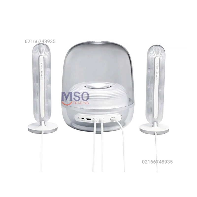 اسپیکر بلوتوثی مدل Soundsticks 5 با طراحی خاص و شیک یک از جدیدترین محصولات کمپانی هارمن کاردن است که طراحی منحصربهفردی دارد. این اسپیکر دارای دو اسپیکر ایستاده و یک سابووفر با ظاهر شفاف و نیمهشفاف که با نورپردازی داخلی خاص جلوهای زیبا به محیط میبخشد. هر اسپیکر وزنی حدود 800g و سابووفر 3.7kg دارد. این محصول بیشتر برای استفاده خانگی میباشد و قابلیت حمل را ندارد. بدنه اسپیکر از پلاستیک مقاوم و باکیفیت ساخته شده و ضد آب نیست. اسپیکر بلوتوثی هارمن کاردن از اتصال بیسیم و بلوتوث نسخه 5.4 پشتیبانی میکند و امکان اتصال همزمان چند بلندگو را نیز در اختیارتان میگذارد. علاوه بر بلوتوث، اتصال از طریق USB Type-C و HDMI ARC ممکن است.